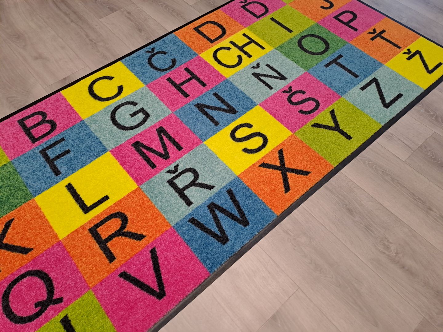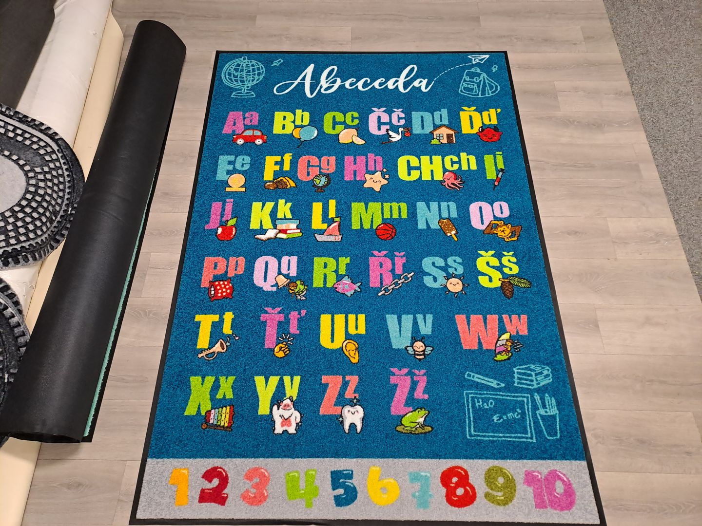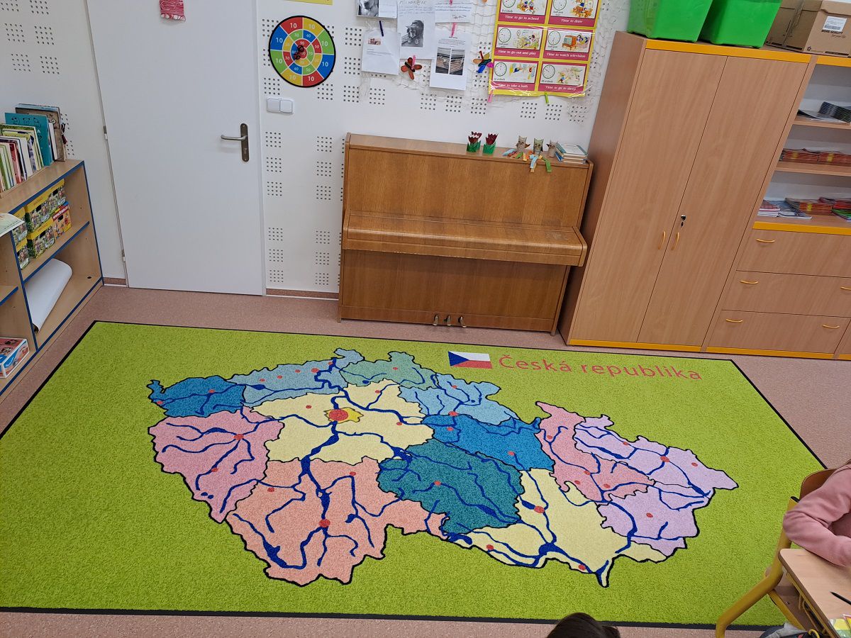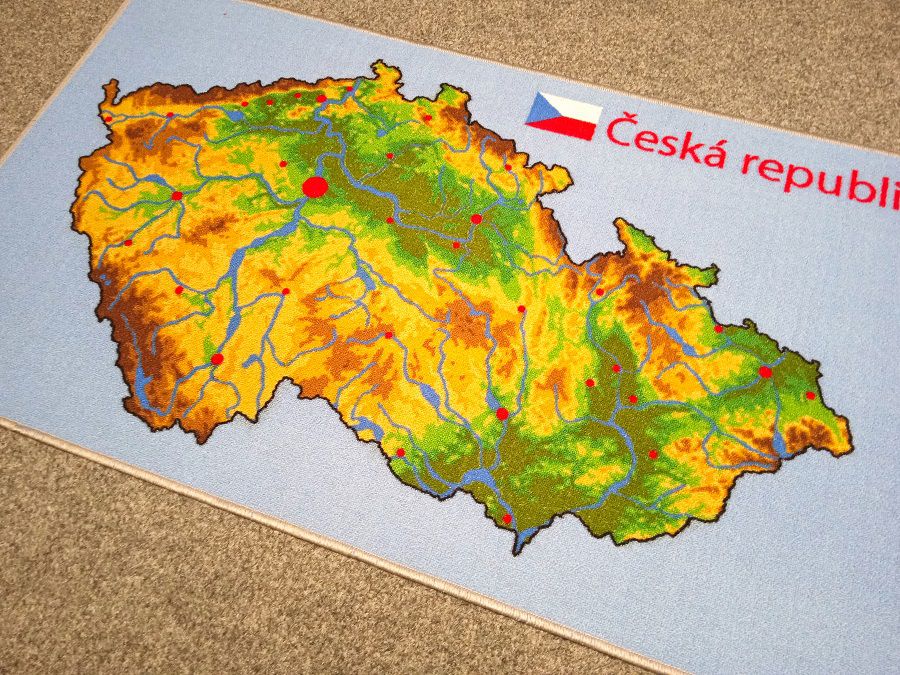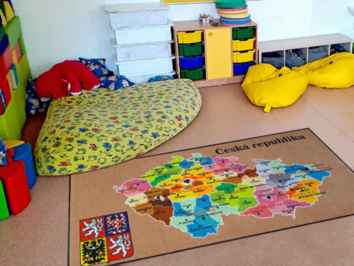 Koberce vyrábíme na zakázku s různými motivy – od abecedy, čísel a map, po tematické hrací plochy.