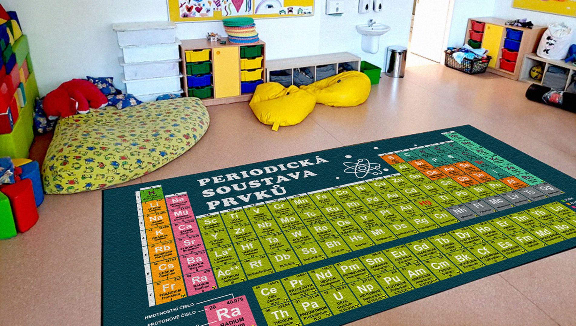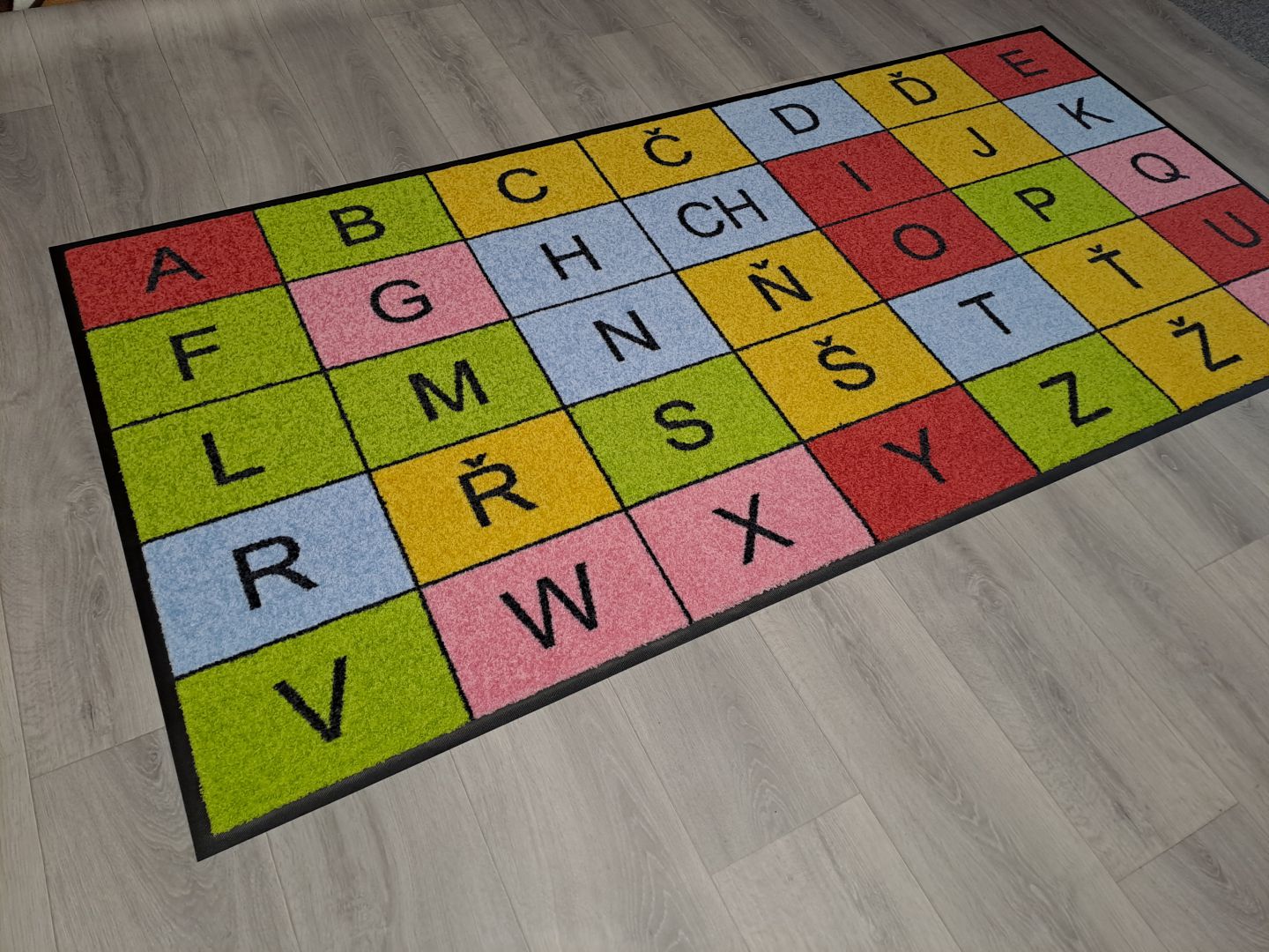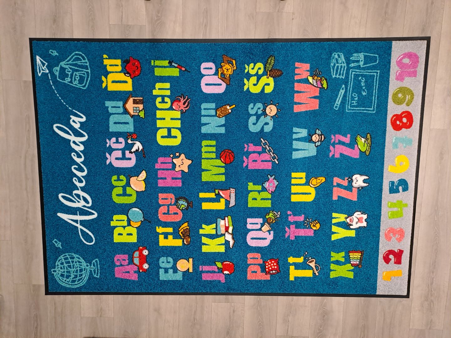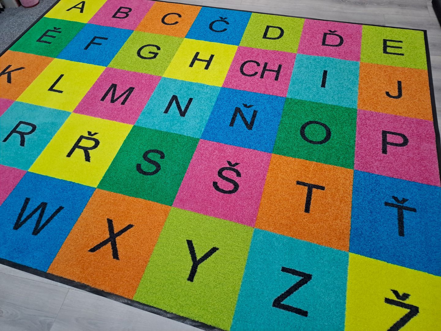 Koberce vyrábíme na zakázku s různými motivy – od abecedy, čísel a map, po tematické hrací plochy.