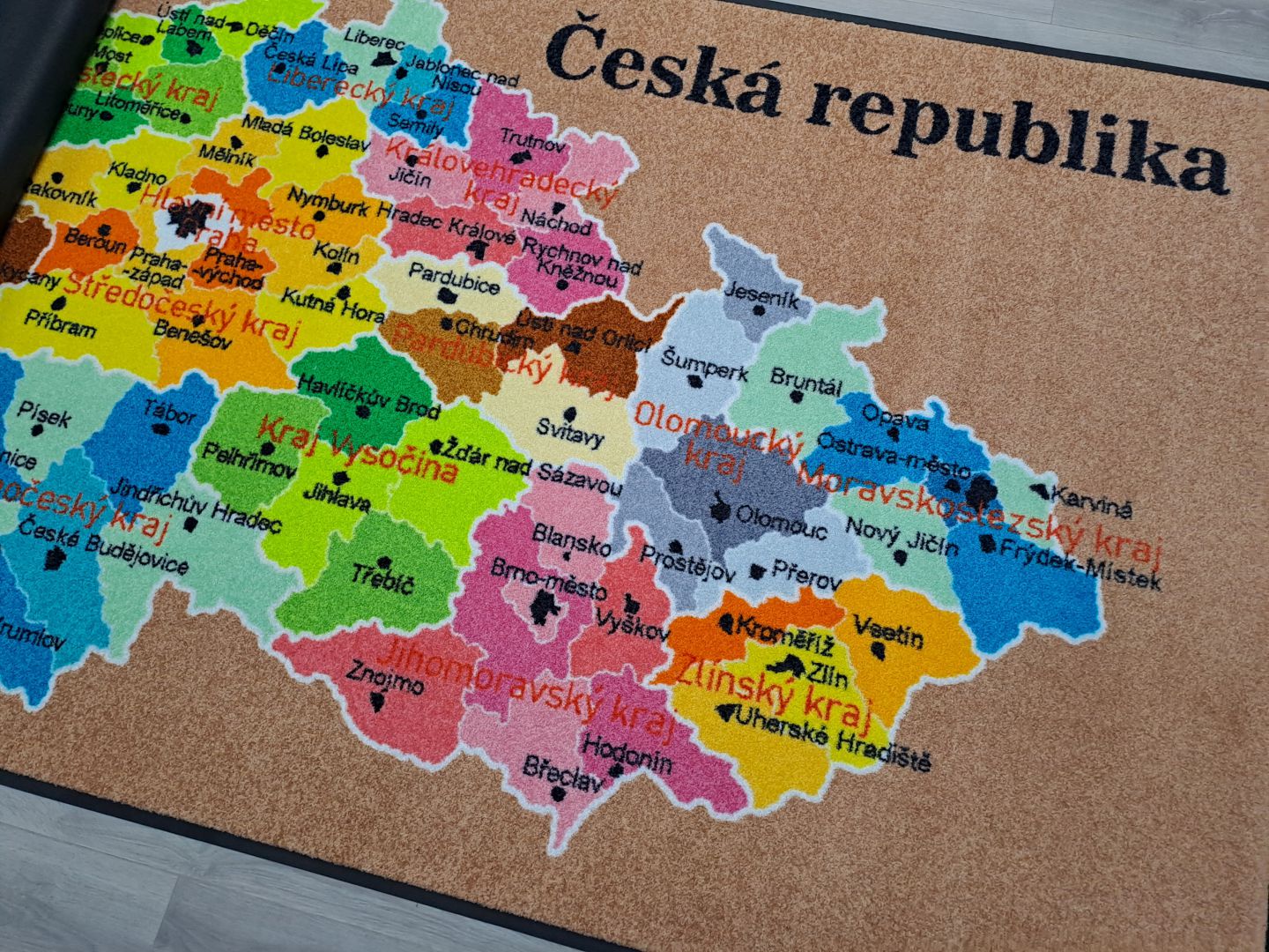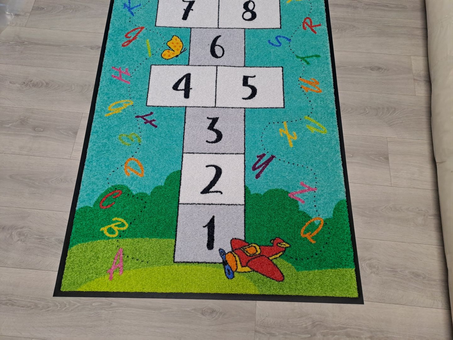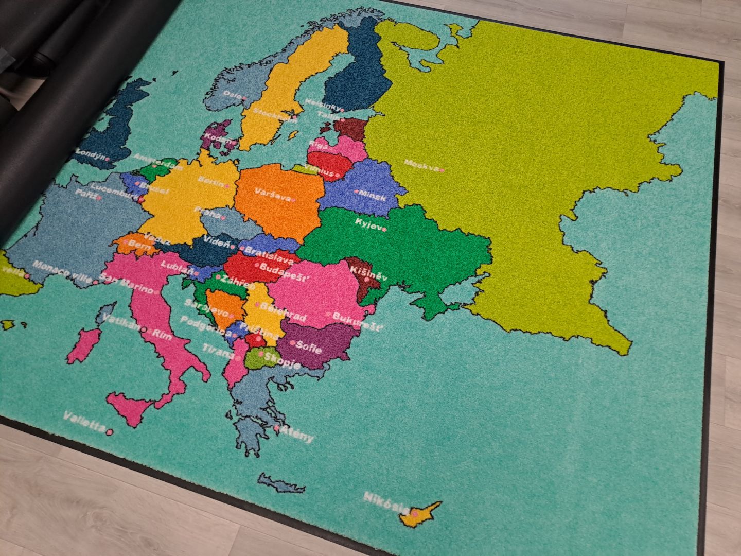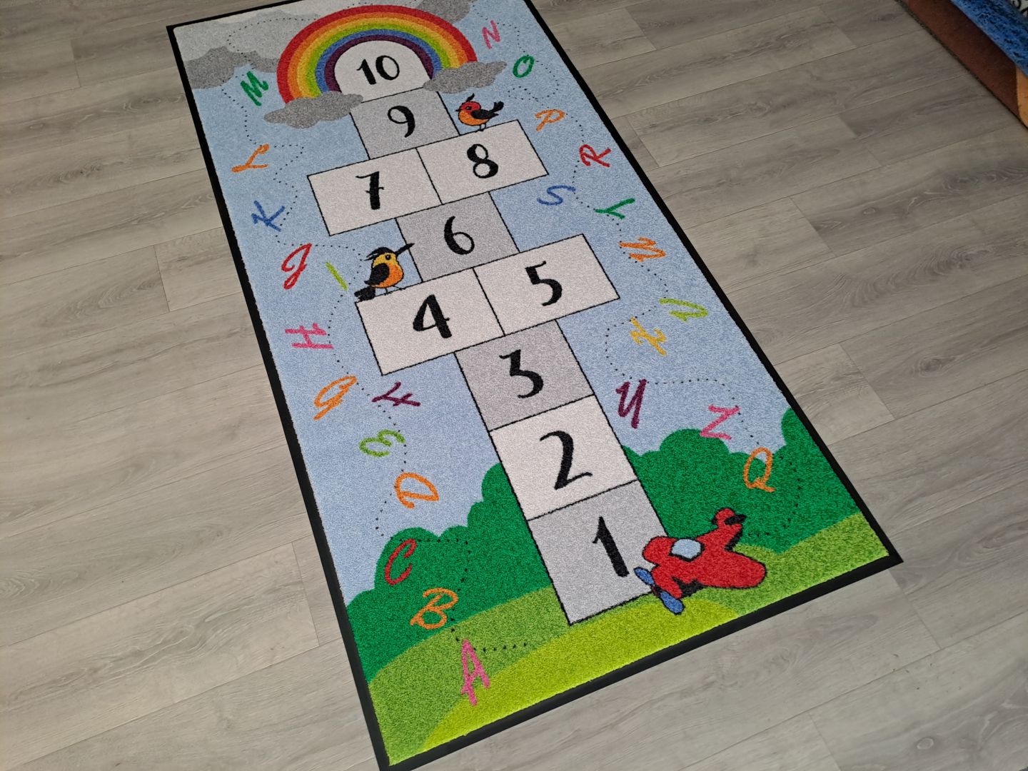Koberce vyrábíme na zakázku s různými motivy – od abecedy, čísel a map, po tematické hrací plochy.